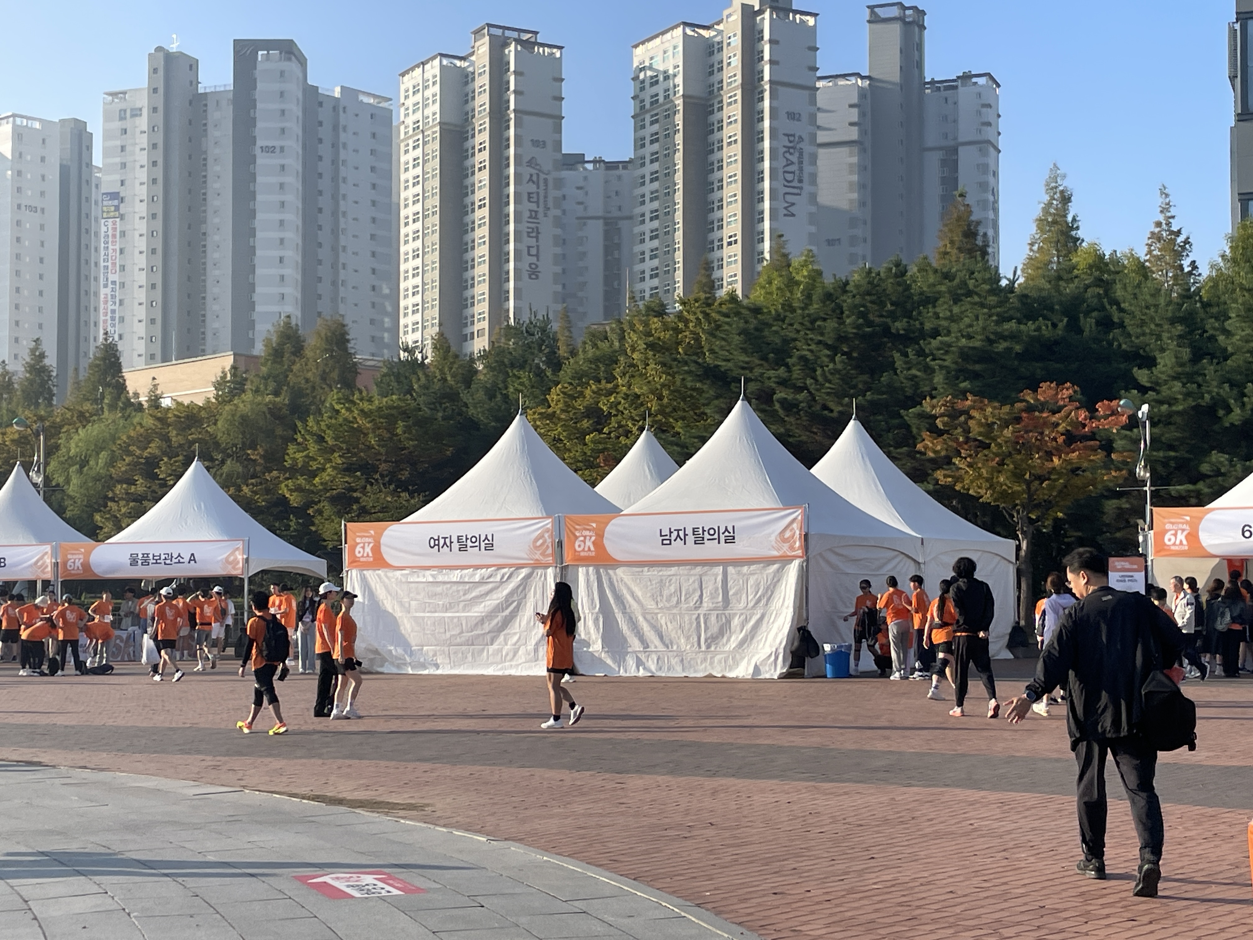 월드비전 글로벌6K 탈의실은 사진처럼 천막 안에서 갈아입는 형태로 운영되고, 바로 짐을 맡기기 좋도록 물품보관소도 옆에 위치하고 있었다.