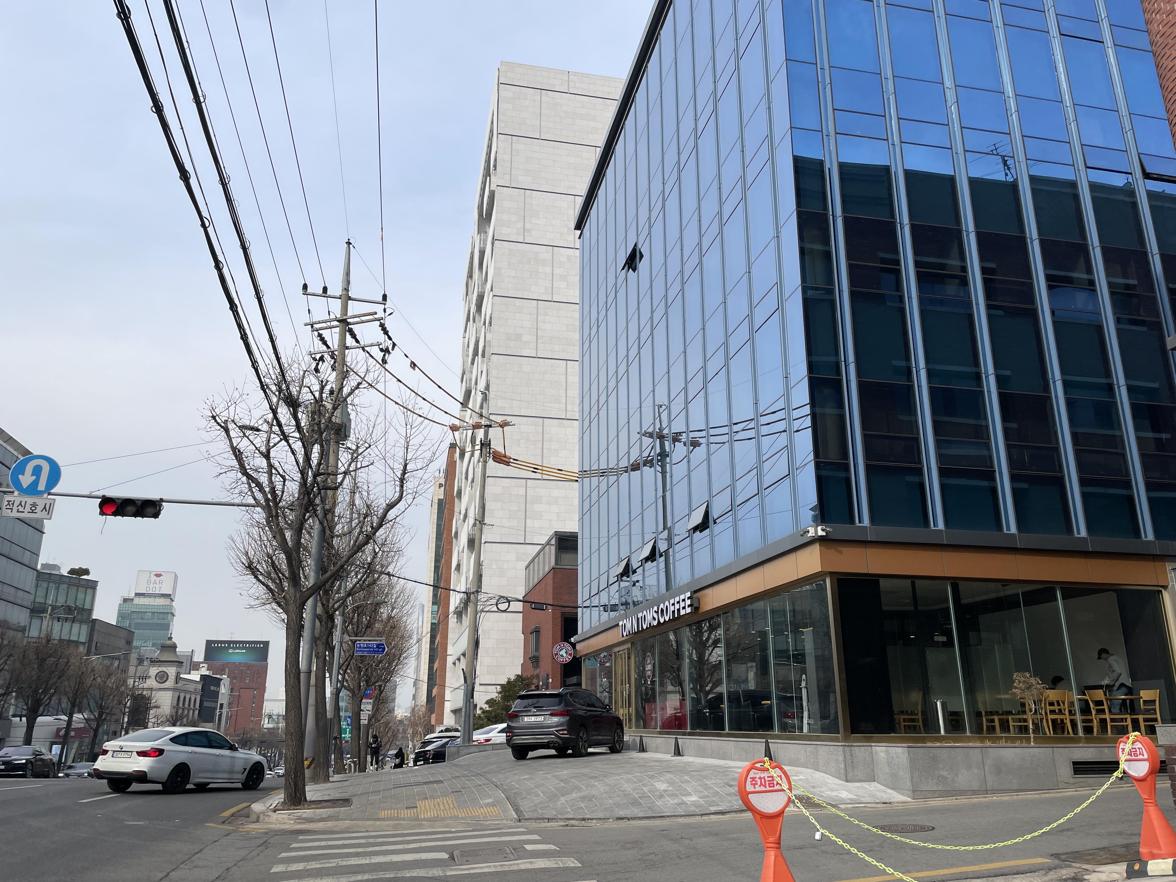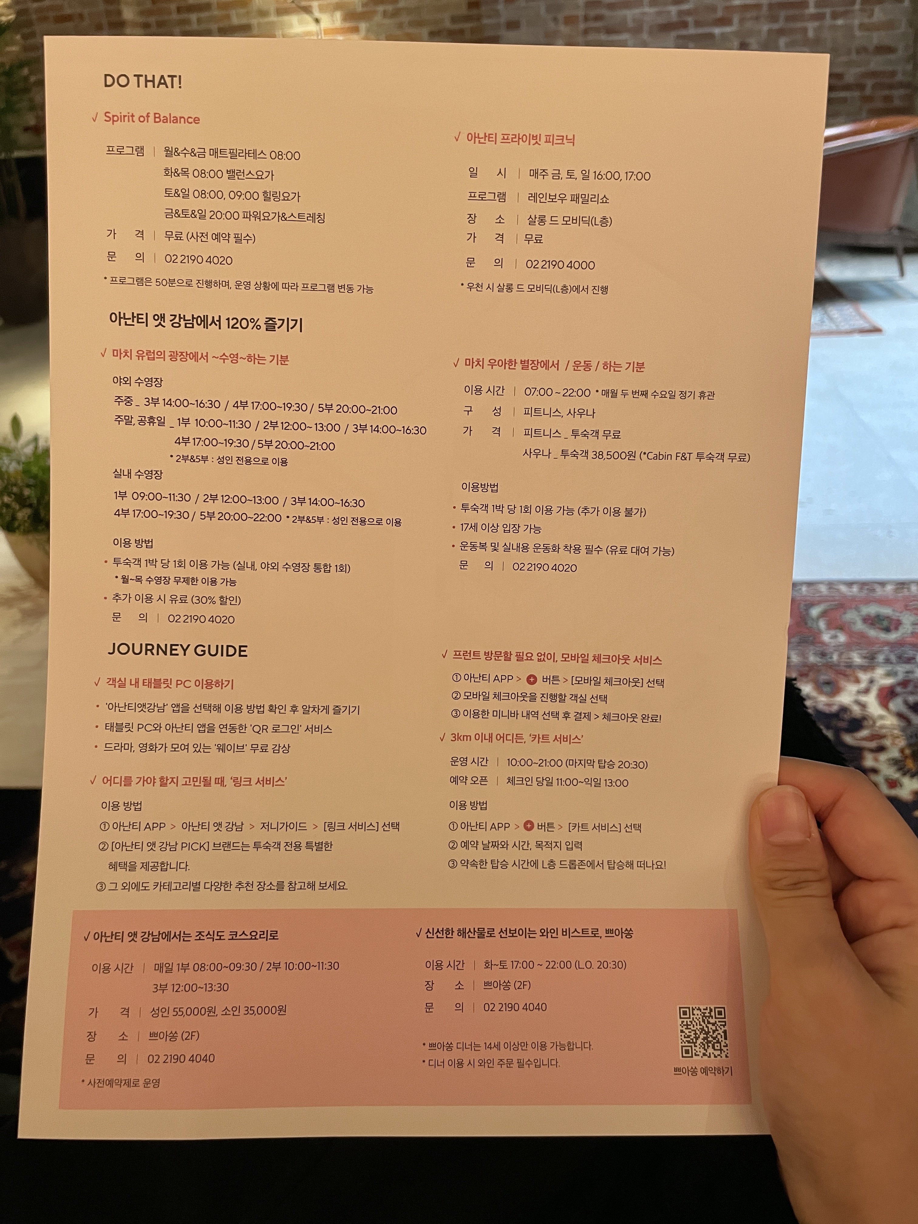 빨간 건물 옆에 있는 하얀색 건물이 아난티 앳 강남의 외부인데 외부에서 들어오면 2층이라 엘레베이터를 타고 로비(L)층으로 내려가면 데스크에서 보관이 가능하다. 친구와 함께 짐을 보관했는데 가방 갯수를 적은 보관증을 주시고, 체크인 시간이 지나면서 들어가니 가방도 미리 올려주셨다.