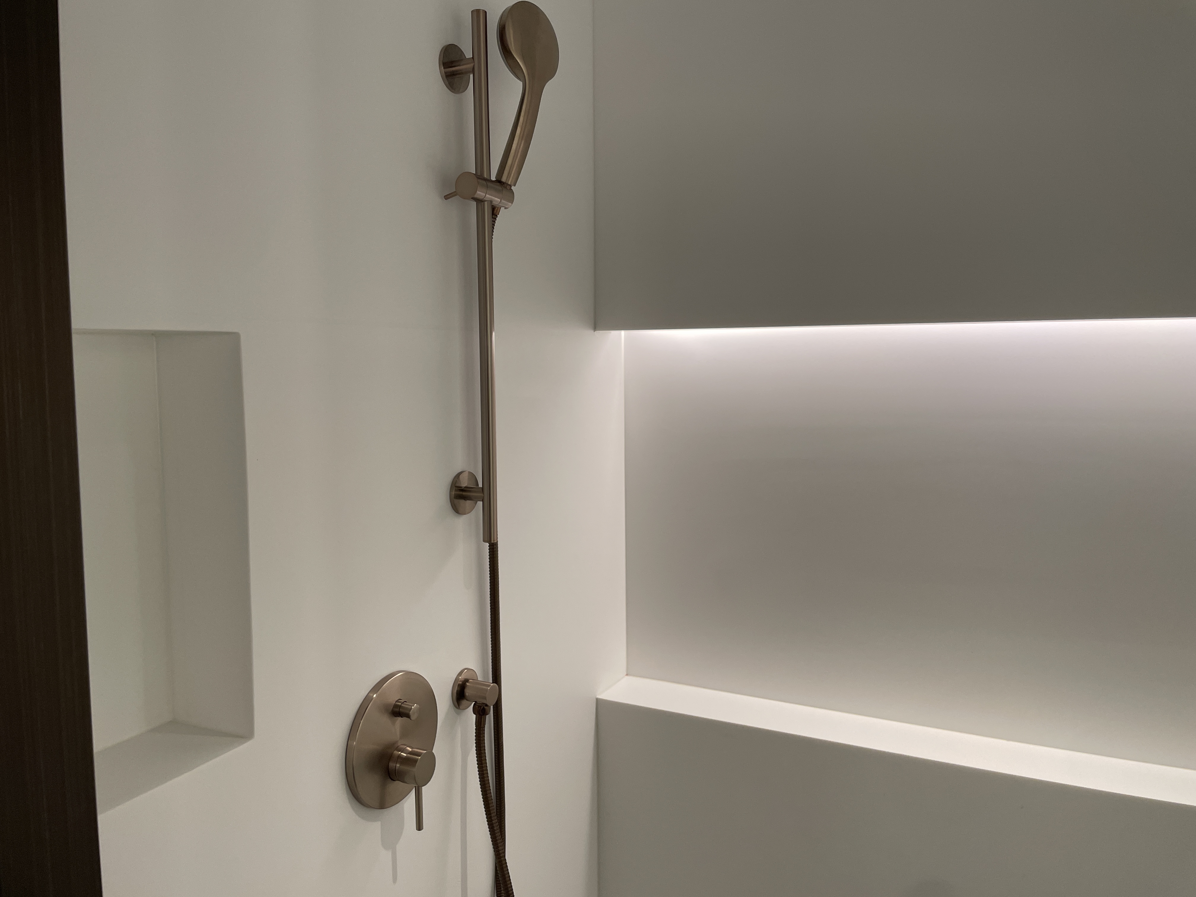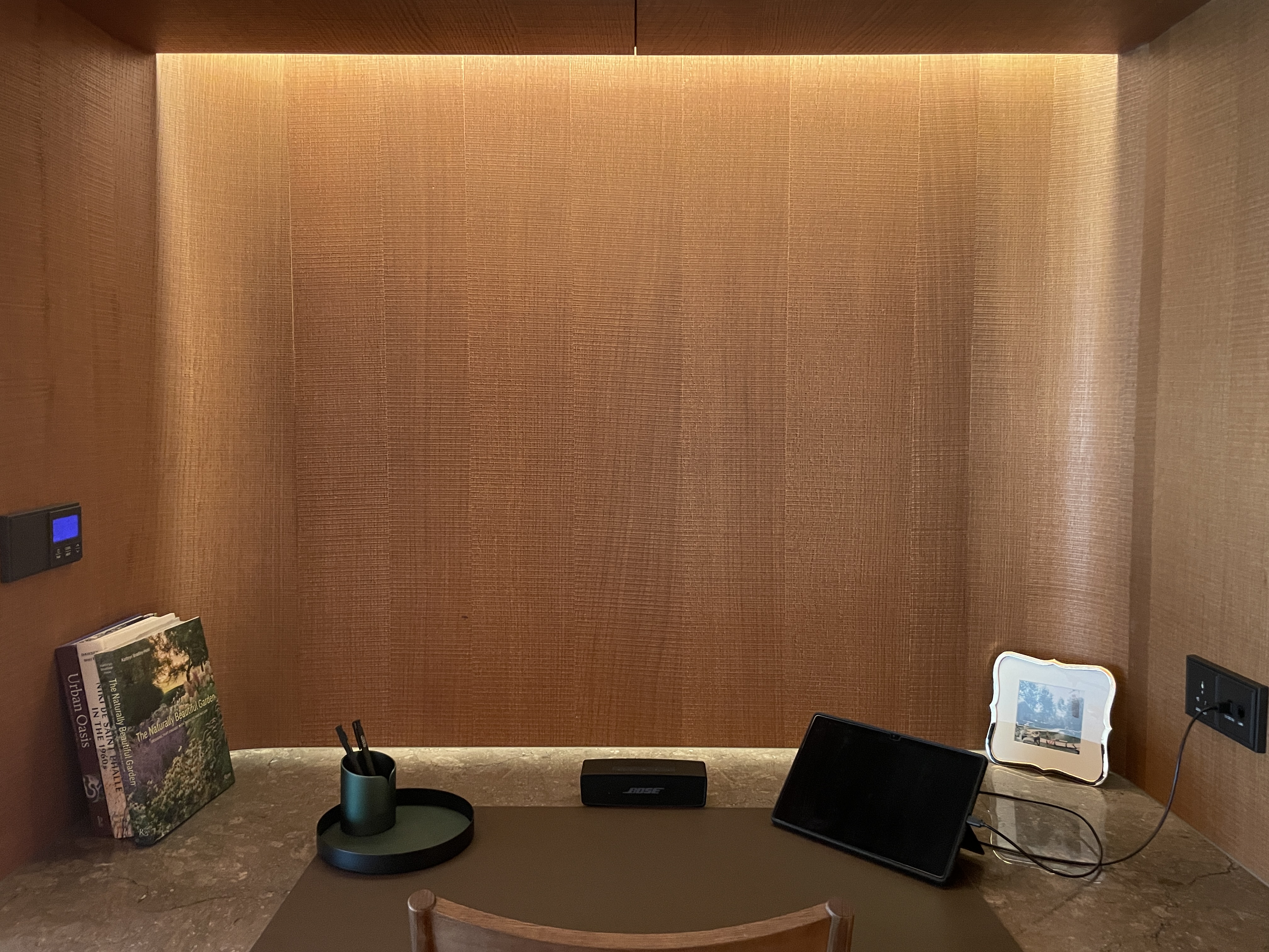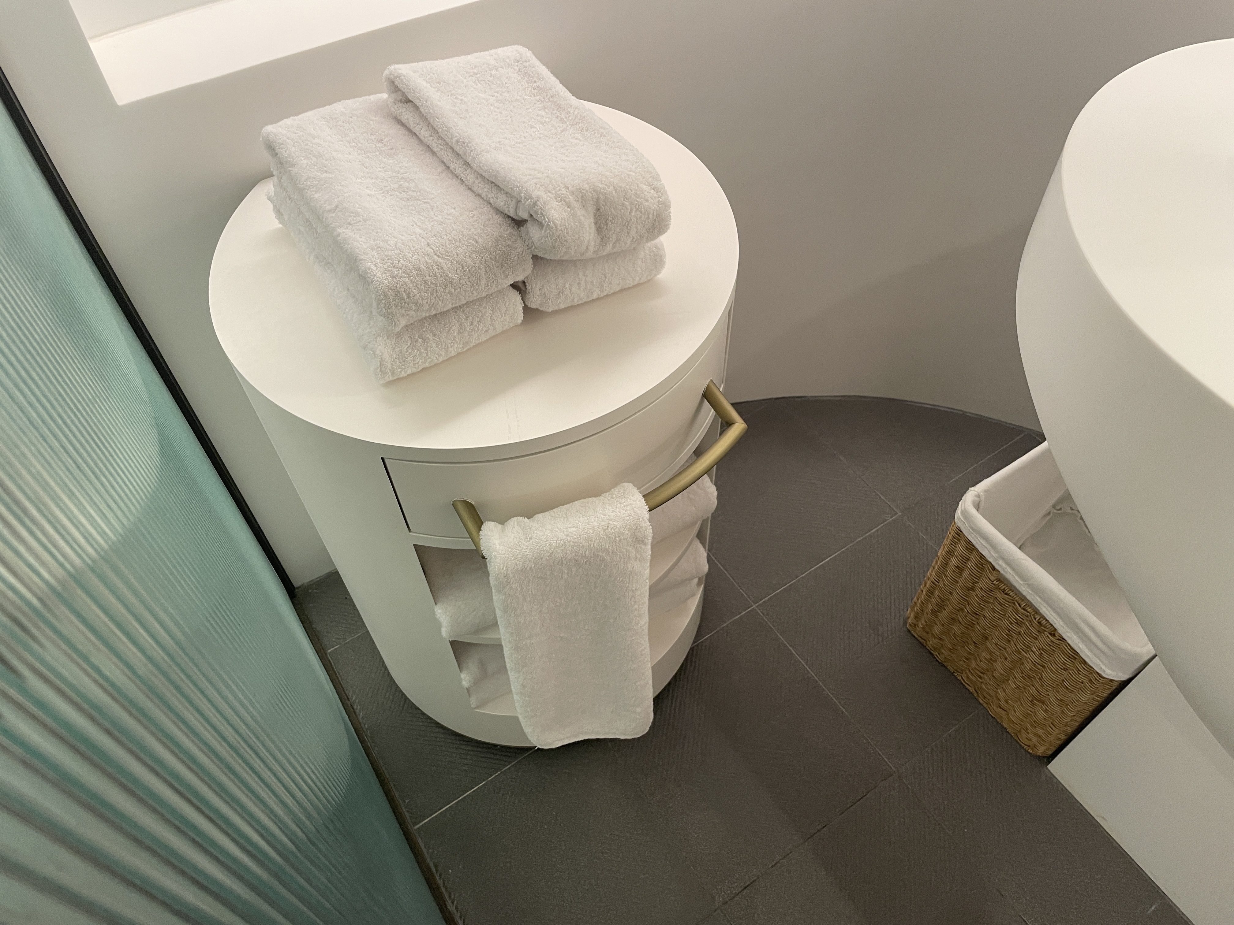 화장실은 따로 1인이 들어갈 수 있는 공간에 세면대1개와 함께 있고, 샤워실+파우더룸에는 욕조와 2개의 세면대, 그리고 사워부스가 하나 있었다. 바스솔트도 구비되어있는데 사용한 수량만큼 결제하면 된다. 내부 간접등도 잘 들어가있고 수전도 깔끔한 디자인에 낮은 채도의 브론즈컬러가 예뻤다. 수영장도 다녀와야하는데 수건도 수량이 충분했다.