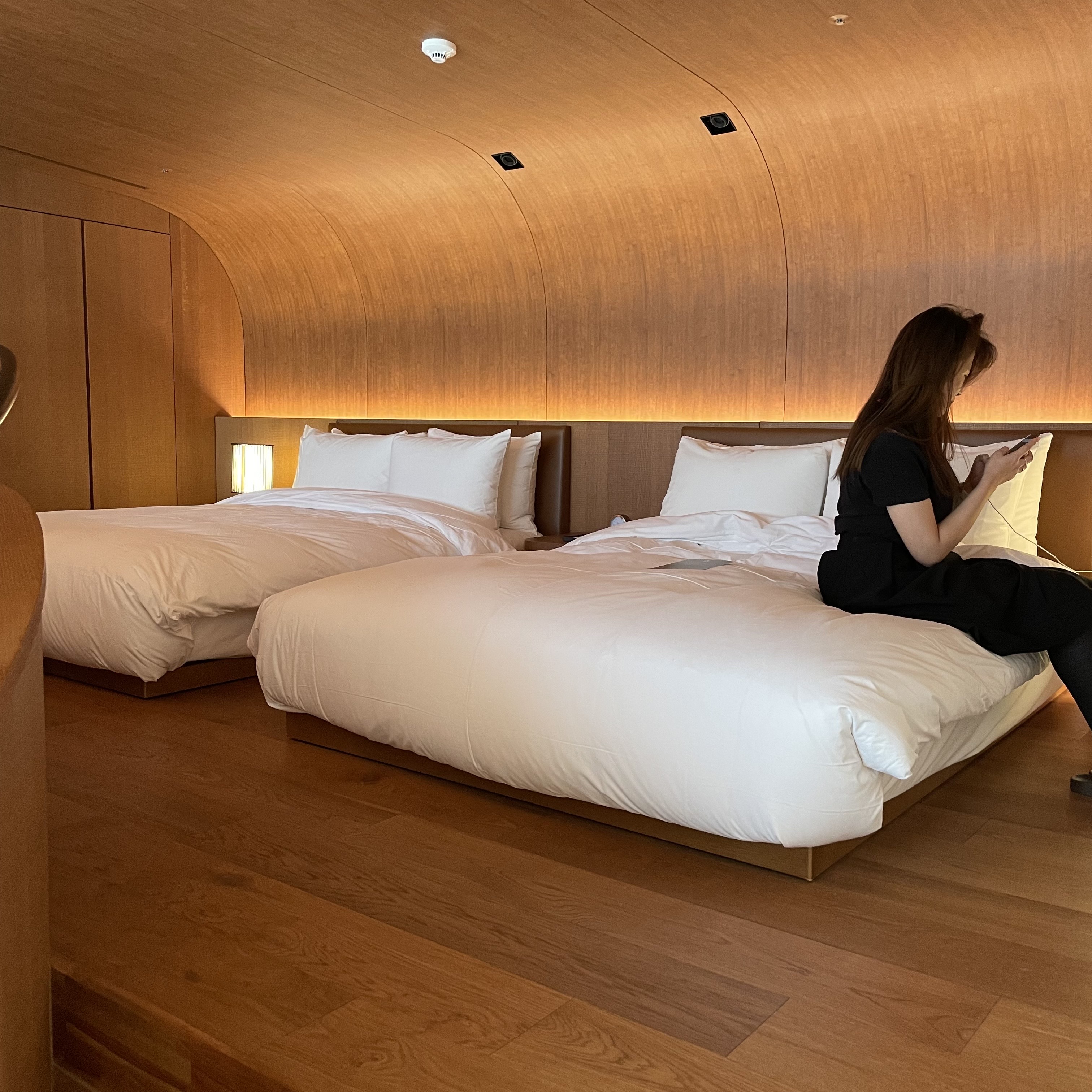 아난티 앳 강남 캐빈U가 있는 T3층은 복층 객실로 이루어져 있다. 대부분 복층으로 이루어진 넓고 높은 객실이지만 캐빈 U의 가장 좋은 점은 최상층에 위치한 복층객실이라는 거겠지! 복층에는 2인이 누울 수 있는 침대가 2개이다. 아쉬웠던 점은 침대의 각각 끝에만 콘센트를 꽂을 수 있고 무선충전도 한개만 가능했다는점,, 그리고 무선충전이 잘 되지 않았다.