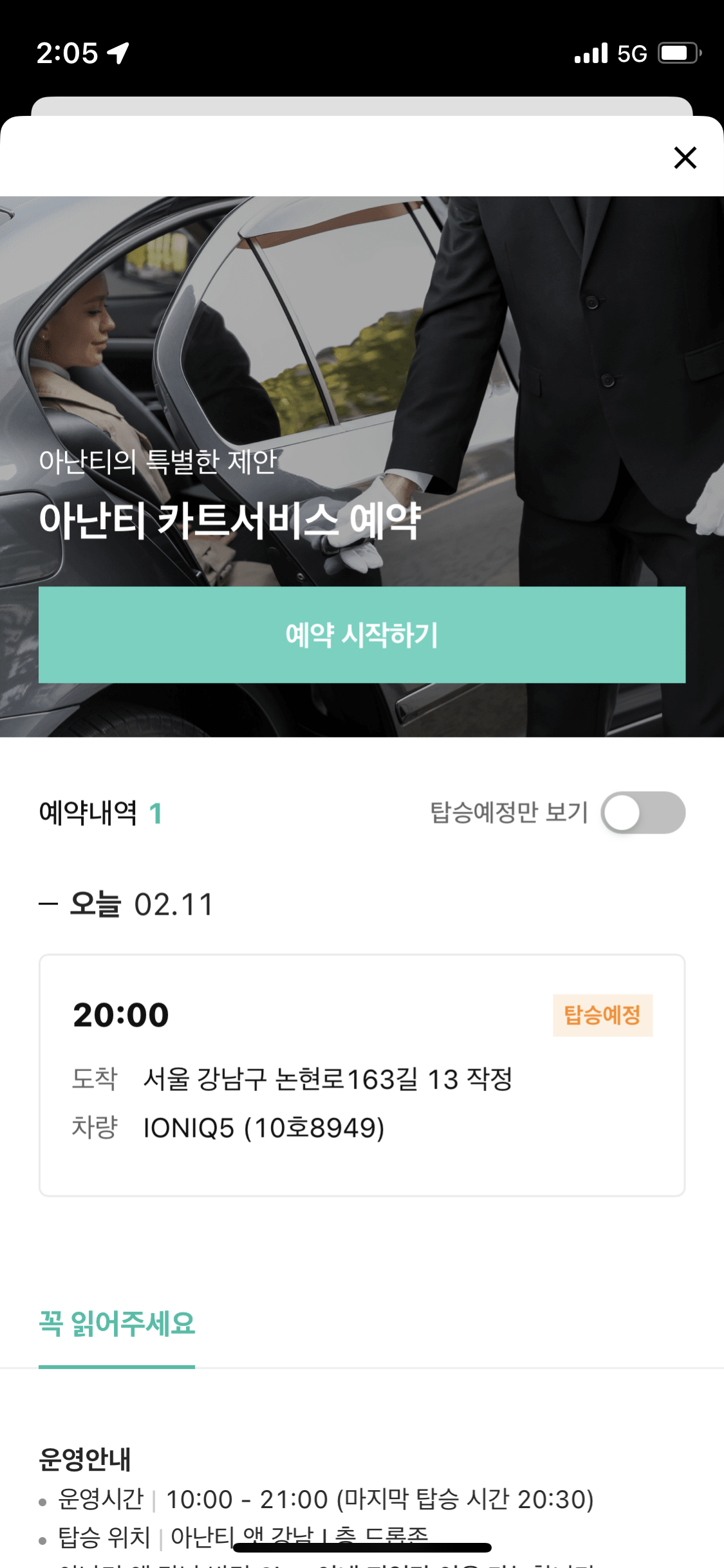 아난티 앳 강남의 아난티 카트서비스는 호텔 반경 3KM 범위 내에서 10:00-21:00까지 이용할 수 있는데 호텔 근처에서 아난티 앱의 우측 하단에 동그라미를 누르면 카트서비스 탭이 활성화된다. 하루에 2번도 이용할 수 있는데, 당일에 2번은 첫번째 이용이 끝난 뒤에 새로 예약할 수 있다.