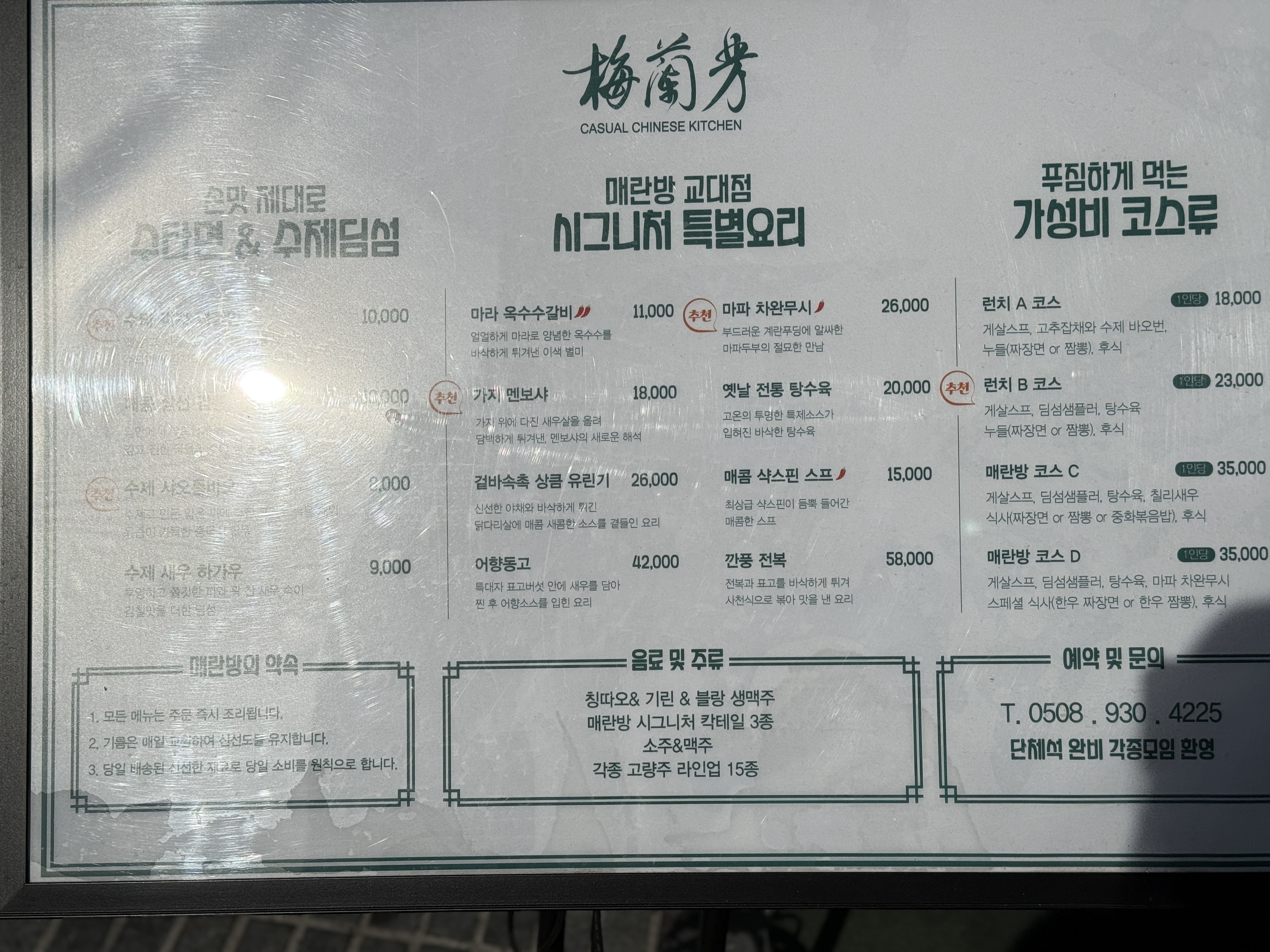 서초역 근처에서 가족들과 첫 인사를 나누게 되어, 분위기 좋고 부담스럽지 않은 코스 식당을 찾다 보니 ‘매란방 교대점’을 선택하게 되었습니다.
