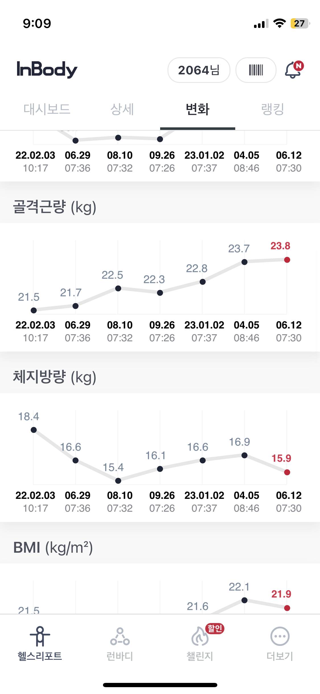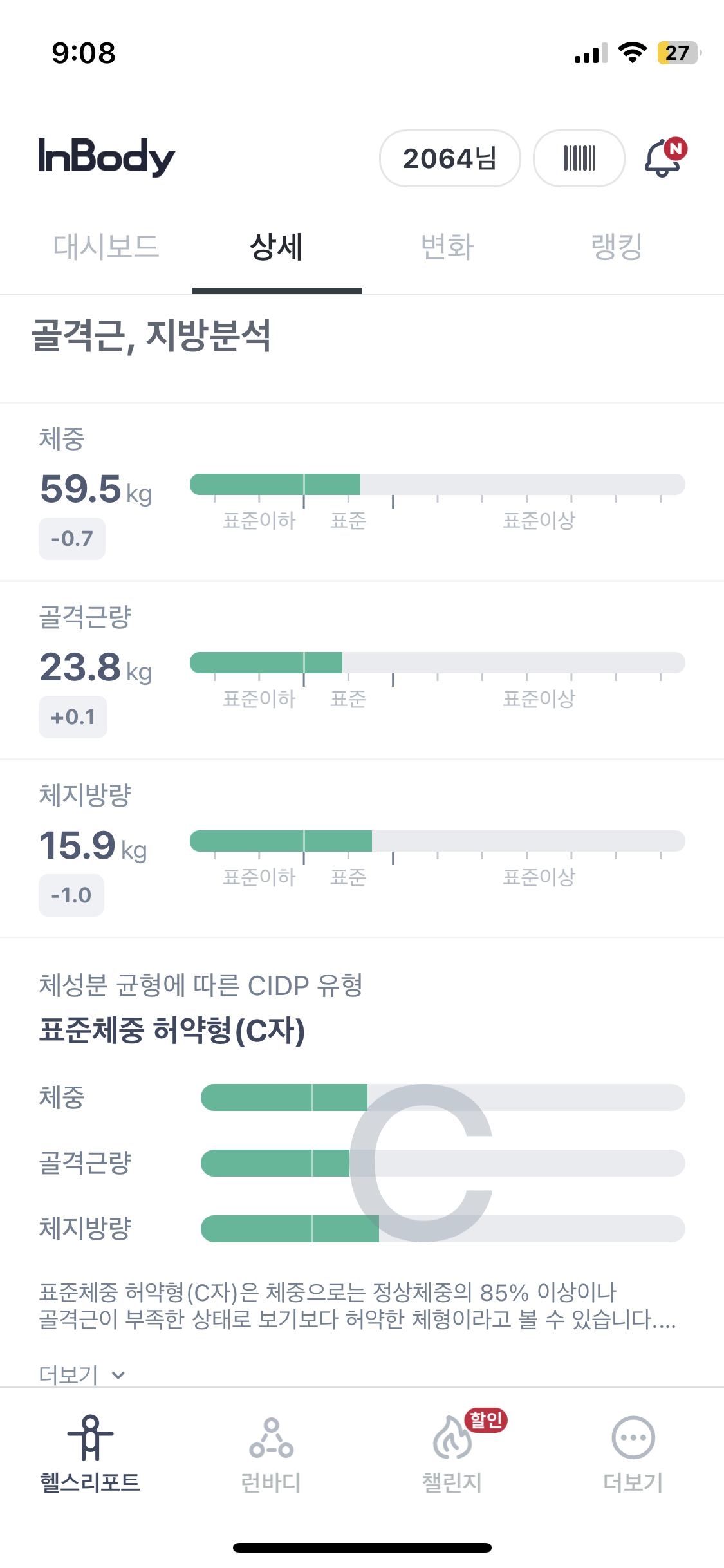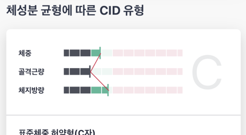 크로스핏 시작 전 나는 정말 딱 표준인 체중에 골격근량은 표준 이하, 체지방량은 표준 이상으로 가려고 하는 위태위태한 수준의 C였었다.
