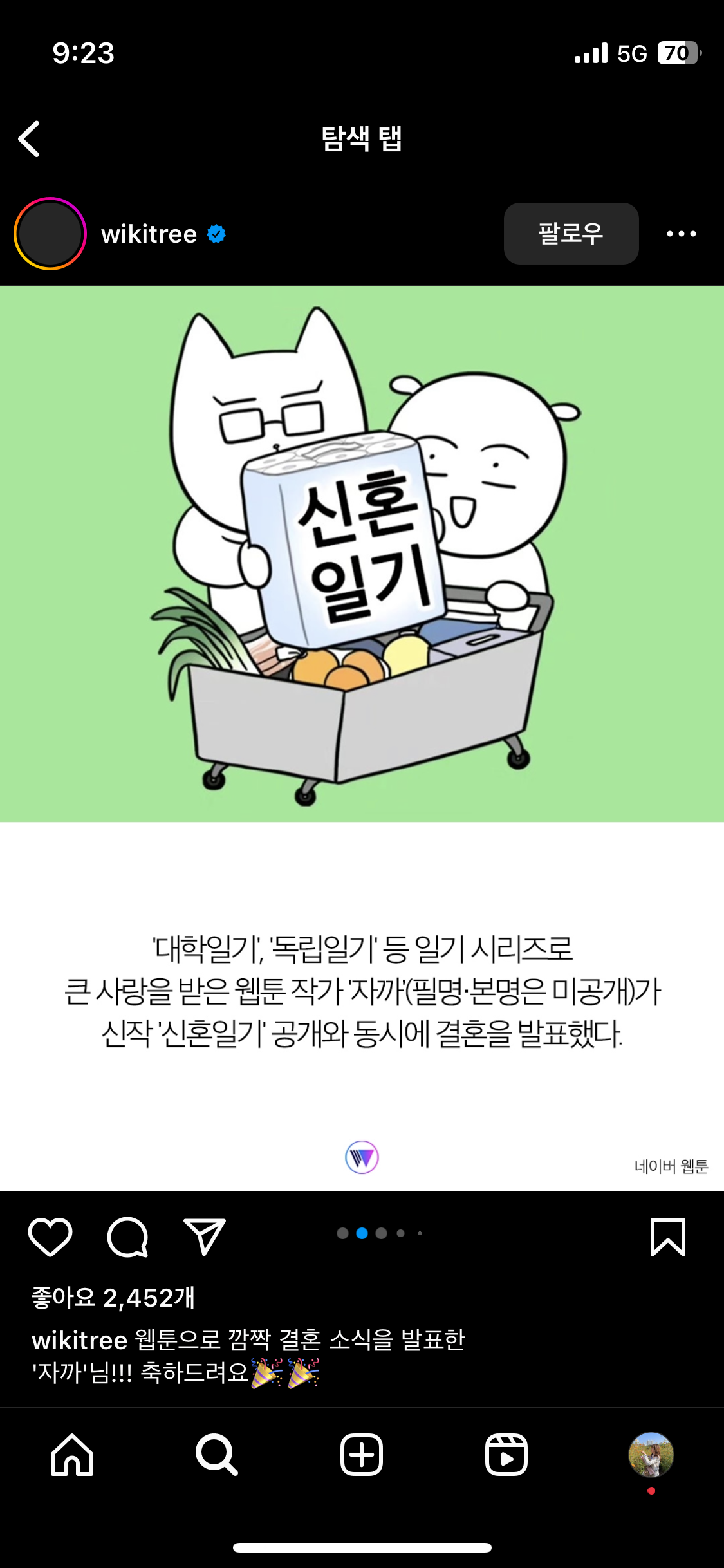 이럴수가... 이럴수가...... 대학일기랑 독립일기 썼던 자까는 사실 솔로가 아니었고,,, 신작은 신혼일기... 동시에 결혼했다고... 마치 고등학교 동창인 친구가 나몰래 연애하고 결혼하고 청첩장도 안주고 갑자기 이사했어~ 하길래 어 왜? 하니까 신혼..이라고 하는거같은 느낌...?