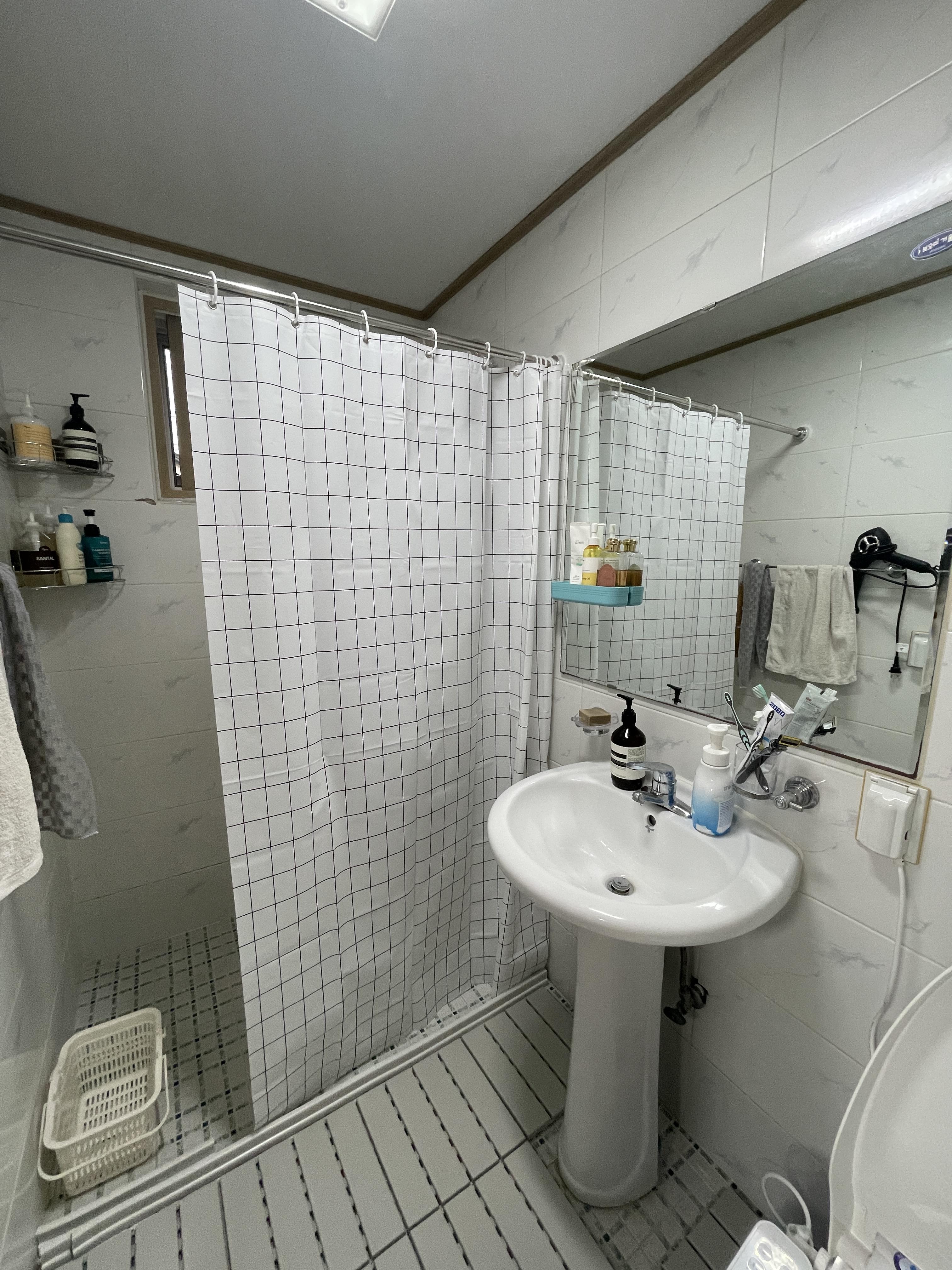 화장실 건식으로 사용하려고 바닥 데코타일이랑 커튼 만들었다! 뿌듯〰️