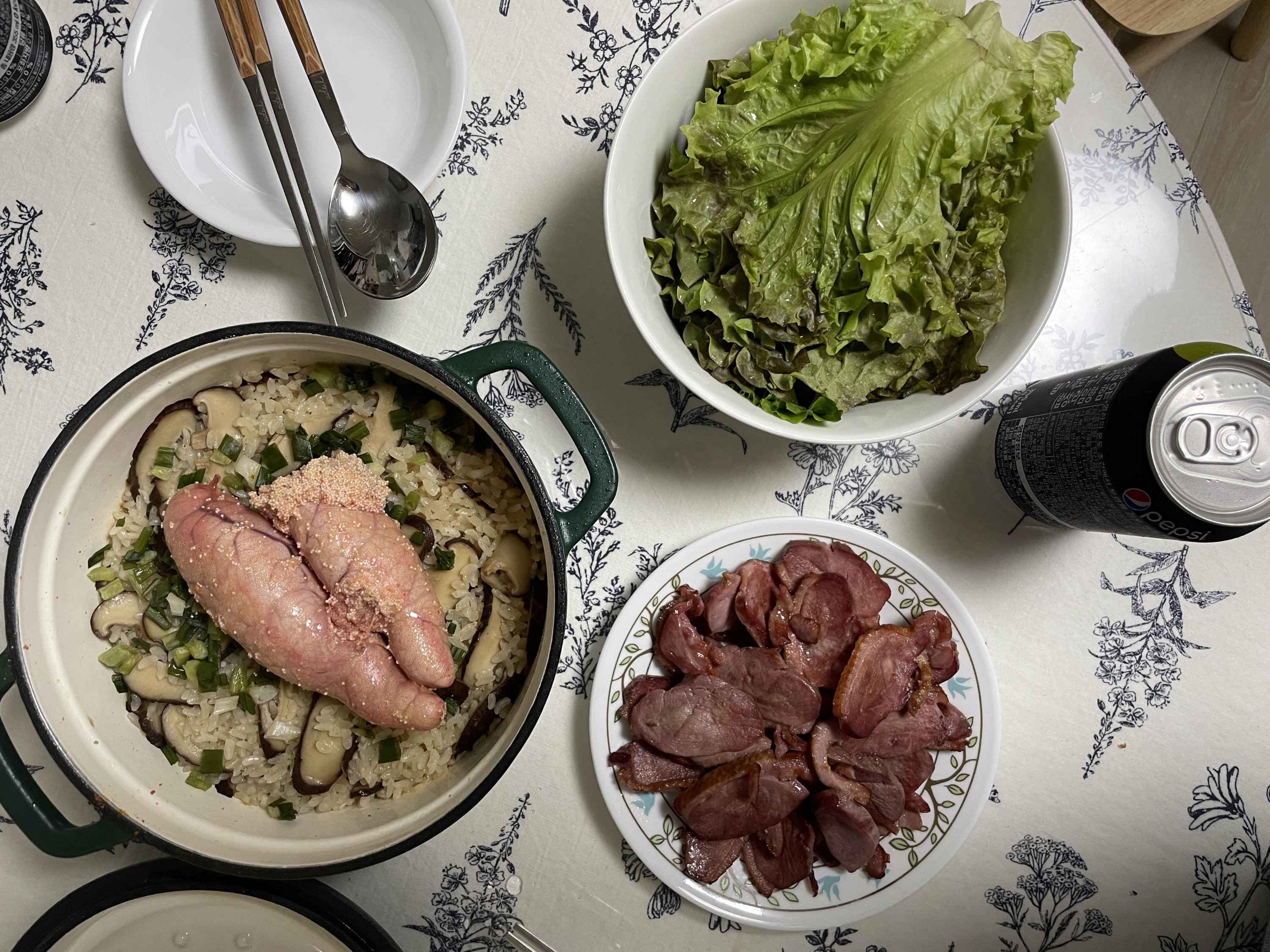 회사 간식 살 때 슬쩍 명란도 담아서 명란솥밥 야무지게 해먹기! 버섯도 썰어넣고 같이 먹었는데 상추에 솥밥 싸먹어도 은근 맛있던데! 상추에 솥밥 넣고 오리고기 슥 넣어서 먹으니 건강하고 좋아!