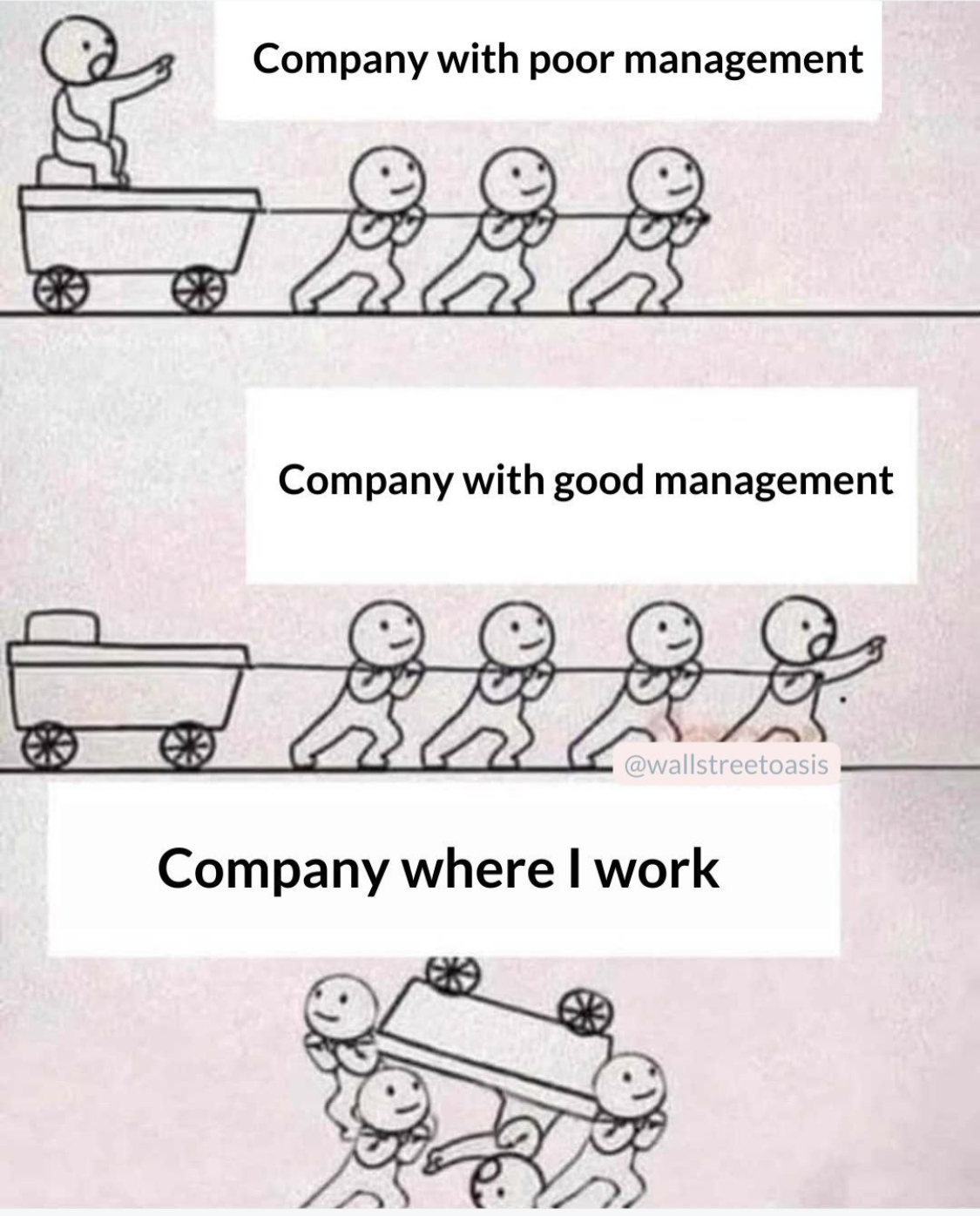 요즘 내 기준으로 poor management인 리더와 함께 일을 하고 있다고 여겨져서 많이 공감한 짤이다. 함께 cowoker로 나가는 것도 좋겠지만, 인테리어라는 업무 특성 상 경험치에 의한 업무 책임도가 다르고, 방향성과 기준이 달라지기 때문에 수직적인 구조가 필요하기 때문에 두번째 같은 good management가 필요한데 우리 회사는 매니징에 대해 고민하는 사람이 다들 아랫사람들 뿐인 것 같다 (?)