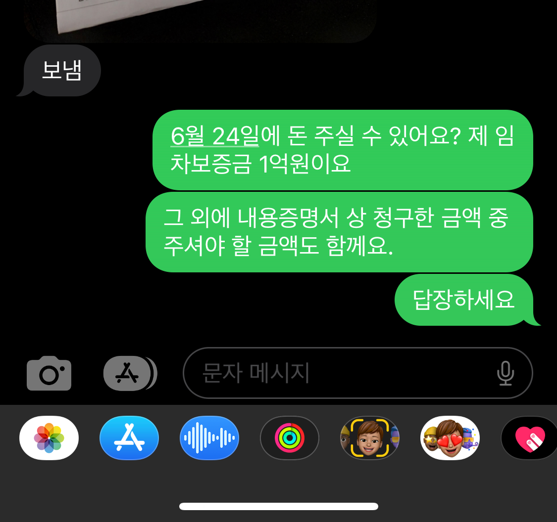 전 글에도 올렸듯이, 계약갱신권 청구 후 중도 퇴실할 때에는 묵시적갱신과 같이 간주하여 임대차법 6조 2항에 의거, 계약 해지 통보를 할 수 있고 그 효력은 3달 후에 가능하다. 예를들어 3월 15일에 통보했다면 6월 15일엔 보증금을 받아 나갈 수 있다는 이야기. 나는 3월 22일에 통보했고 6월 24일을 이사일로 얘기하였는데 해지통보한 날로부터 3개월 이후면 받을 수 있는거라 6월 22일에 받을 수 있는거라고 하셨다.